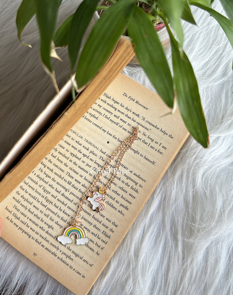 The bookmark features an exquisitely detailed unicorn charm, its mane flowing with ethereal grace, and a vibrant rainbow arching above. The combination of these enchanting elements adds a touch of fantasy and wonder to your reading adventures, making it the perfect companion for lovers of magical realms and imaginative tales.